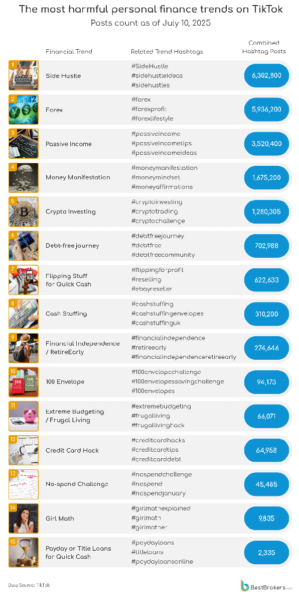 To uncover which TikTok personal finance trends carry the greatest hidden risks, and to evaluate the reliability of much of the platform’s financial advice, the team at BestBrokers analysed trending hashtags and post counts, ranking 15 viral personal finance trends based on the number of posts using the three hashtags most commonly associated with the trend. For the most popular trends, the team conducted additional analysis of the top 10 most liked videos from the past six months. The full dataset, complete with links to the TikToks in question, is available on Google Drive here.